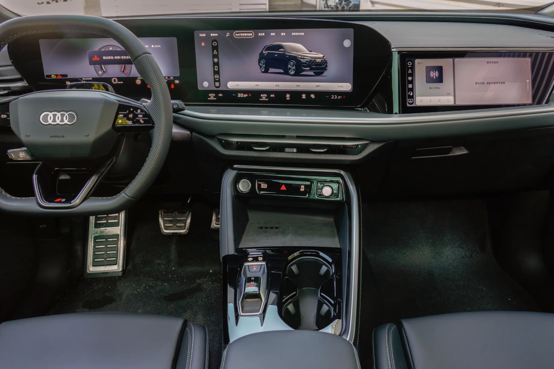 新车告别了过去那块经常被吐槽“突兀”的立式中控屏,换装了奥迪全新一代三联屏座舱布局。