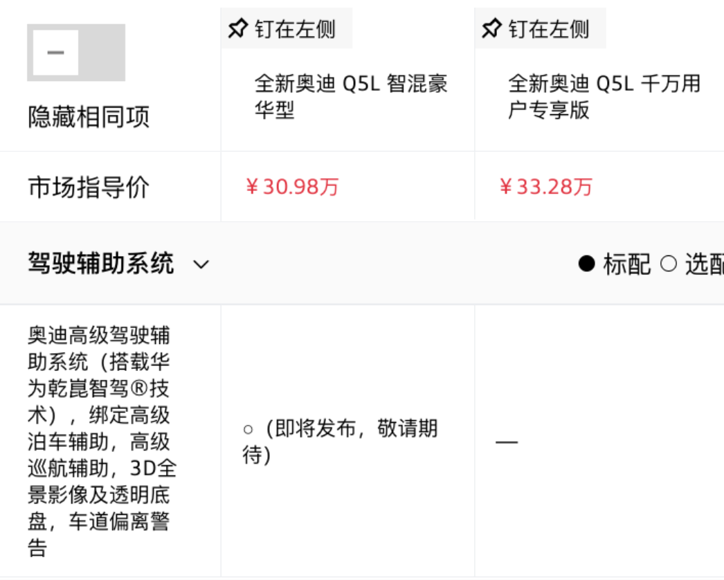 值得一提的是,本次Q5L主打的华为乾崑智驾在全新Q5L上全系均为选装配置。