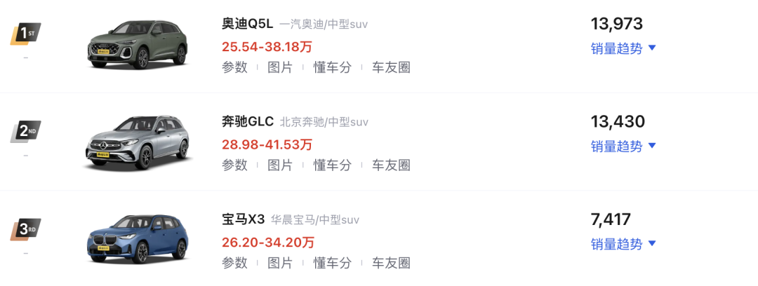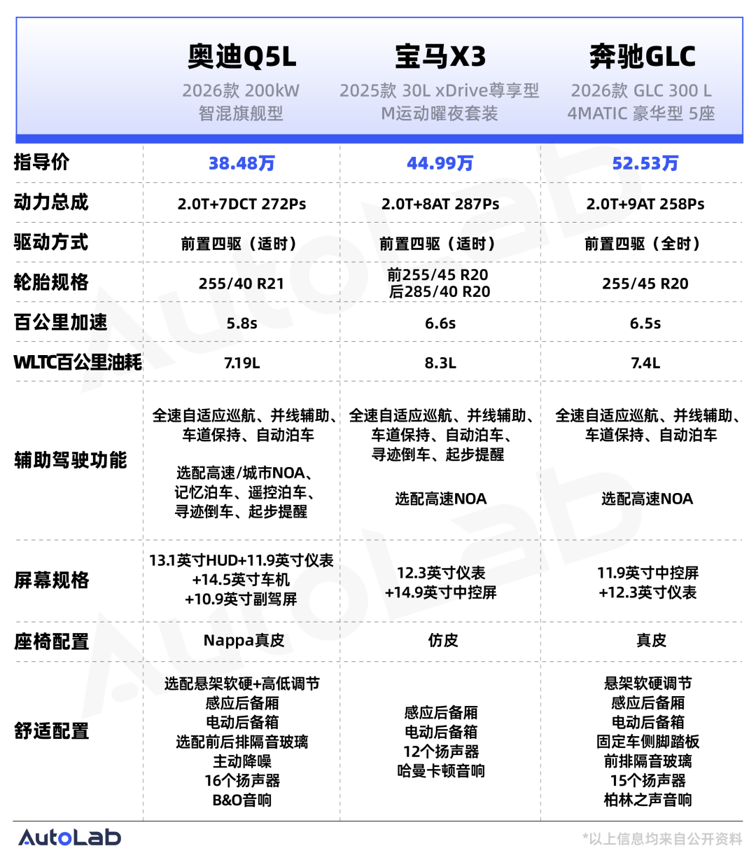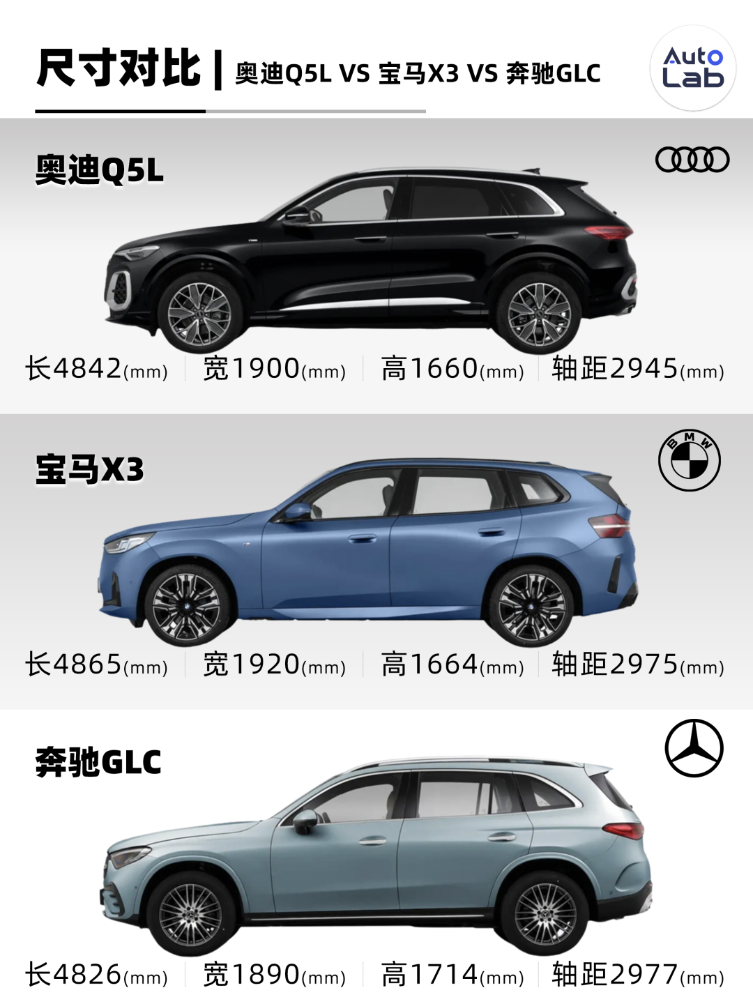 三款车分别为奥迪Q5L“200kW 智混尊享型”、宝马X3“30L xDrive 尊享型 M运动曜夜套装”、奔驰GLC“GLC 300 L 4MATIC 豪华型 5座”。