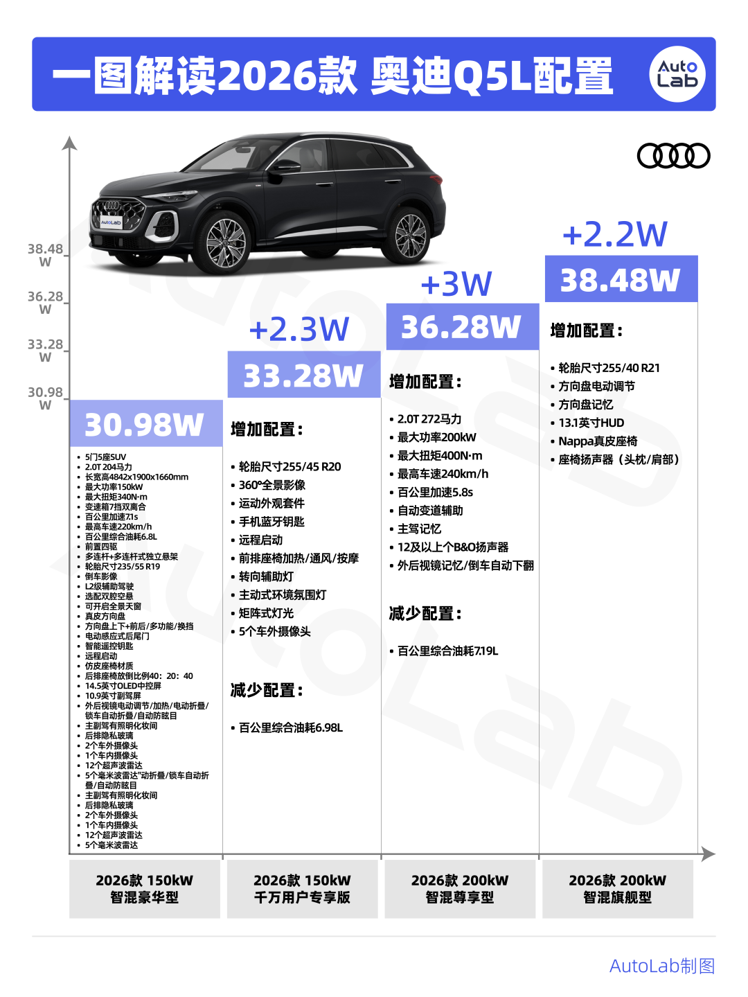 全新Q5L共有4个SKU,起步价一口气降了4万,但配置反倒是不降反升了。