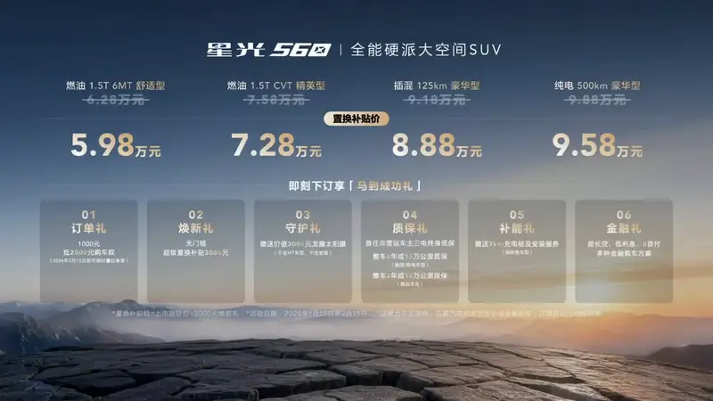 动力方面,星光560两款燃油版车型均搭载1.5T发动机,发动机最大功率130kW、最大扭矩290N·m,匹配6挡手动和CVT两种变速箱;插混版车型则搭载1.5L发动机+驱动电机的动力组合,发动机最大功率78kW,配合上20.5kWh的磷酸铁锂电池组,CLTC纯电续航125km;纯电版车型则搭载最大功率100kW的驱动电机,匹配56.7kWh的磷酸铁锂电池组,CLTC纯电续航500km,并且支持2C快充。