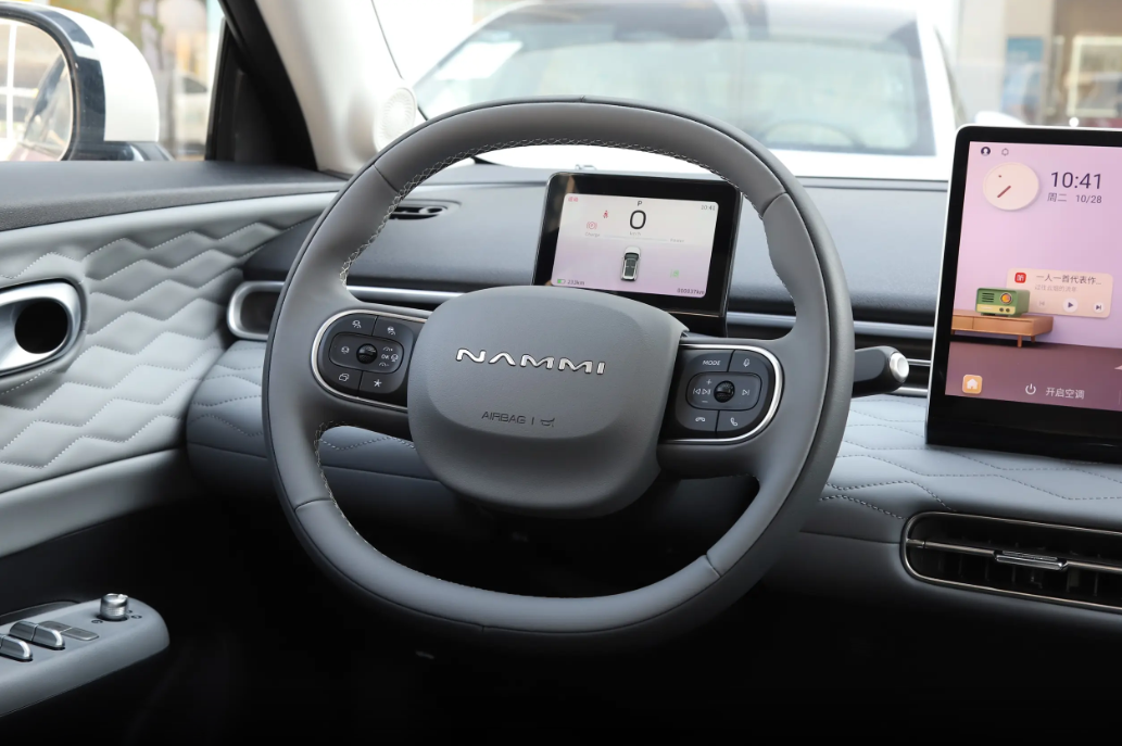 坐进车内,座舱的精致感再次超出了我们的预期。中控台和门板都采用了菱格软包材质包裹,触感细腻柔软,搭配32色音乐律动氛围灯,营造出温馨又轻奢的氛围。5英寸液晶仪表+12.8英寸中控屏的组合简洁大气,车机系统反应灵敏,支持语音控制,喊一句“你好纳米”,就能轻松实现导航、调节空调等操作,对于不熟悉操作的老婆来说非常友好。
