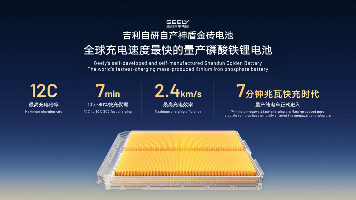 在动力电池领域,吉利神盾金砖电池最高充电倍率可达12C,是目前全球充电速度最快的量产磷酸铁锂电池,10%~80%电量补能最快仅需7分钟,推动量产纯电车进入“7分钟兆瓦快充时代”。