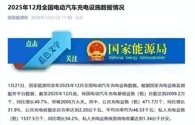 2025年12月底,中国电动汽车充电基础设施(俗称“充电枪”)总数正式突破2000万,达到2009.2万个。