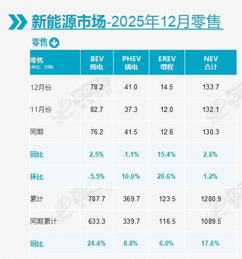 再看1-12月的数据,纯电动市场领书同比增长24.4%,增程同比增长6.0%,插混同比增长8.8%。我们又能得出结论,2025年纯电动零售增长最高,增程反而是最低的。