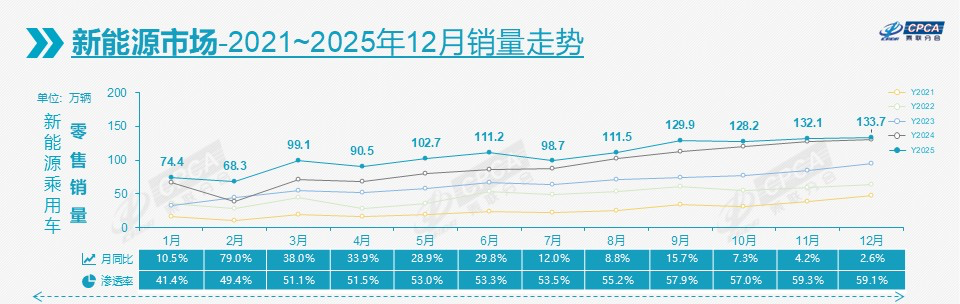 12月,新能源车零售销量为133.7万辆,同比增长2.6%,环比增长1.2%,渗透率达到了59.1%,较去年同期提升9.6个百分点。