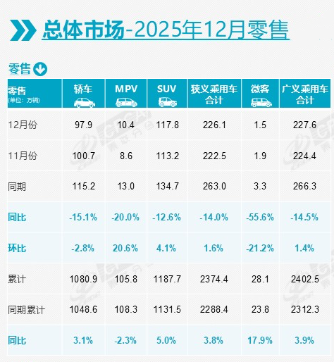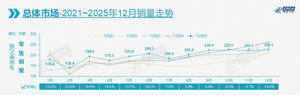 参考乘联分会的数据口径,2025年12月,全国乘用车市场零售226.1万辆,同比下滑14.0%,环比增长1.6%。