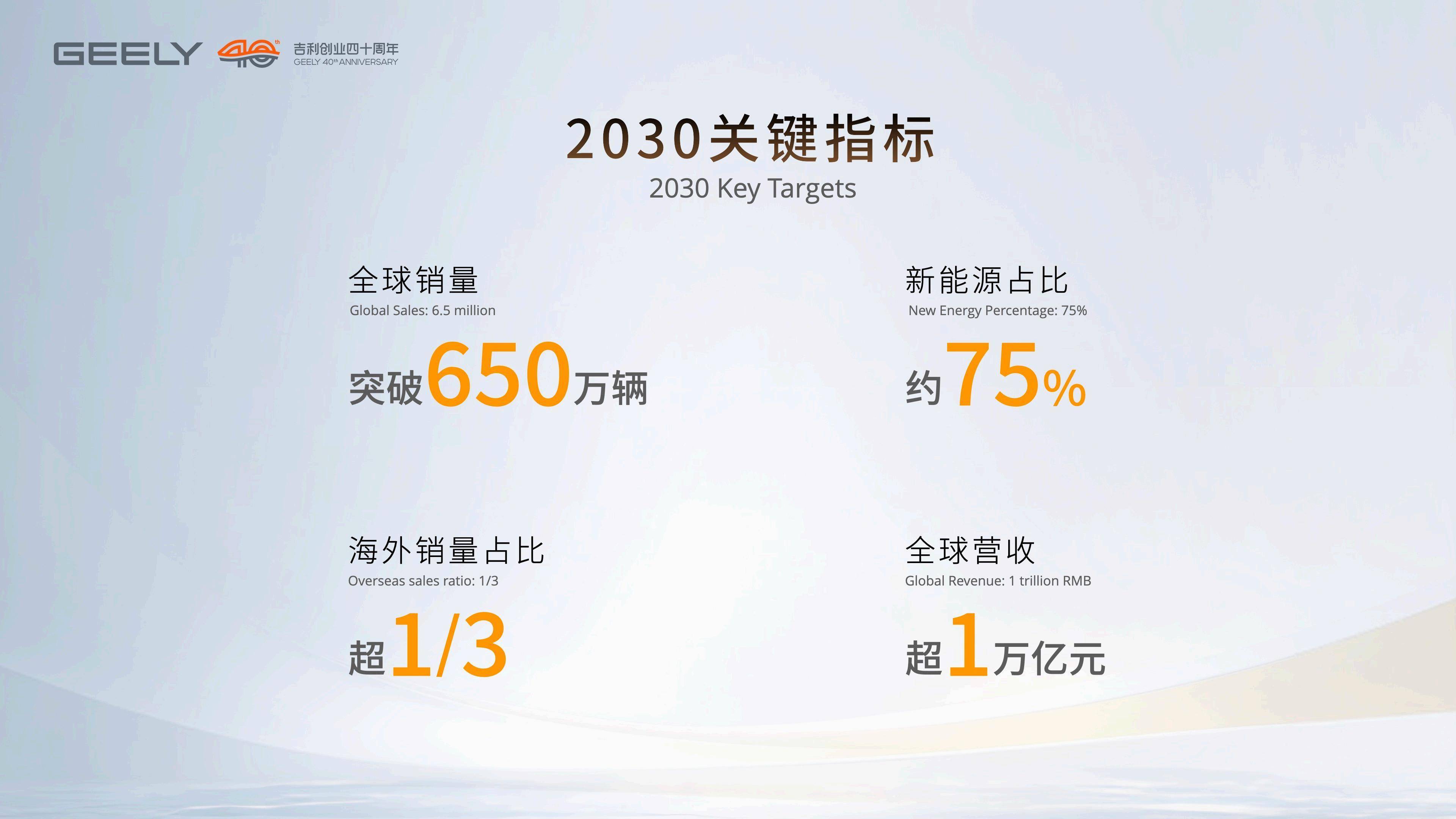 但就在这场全员“拆招”的混战里,吉利却反其道而行之,抛出了“一个吉利,全面领先”的2030目标。