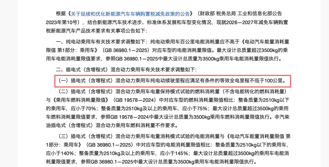 自2026年1月1日起,根据《减免税目录》新规,纯电续航里程低于100公里(WLTC标准)的插混车型将无法享受购置税减免、无法上绿牌。