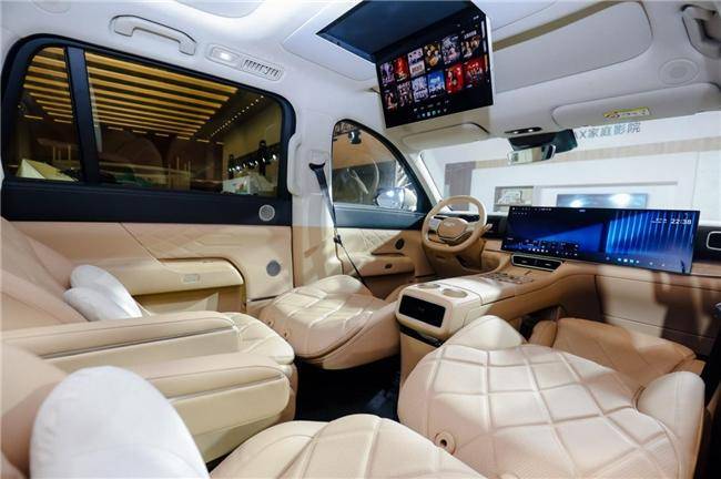坐进车内,你会怀疑自己是不是上了百万豪车。前排一块30吋一体寰宇屏,6k分辨率、超薄窄边框、1000nit亮度、3A防护涂层;后排还有17.3吋后舱娱乐屏,孩子看动画、老婆追剧互不干扰。全车17㎡皮质包覆,随手一摸都是柔软材质,连氛围灯都支持256色律动+音乐联动。