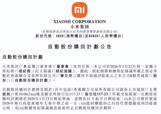 据了解,小米集团1月22日公告称,公司与一家独立经纪商订立协议。据此,经纪商将根据经纪协议所载之预定参数于香港联合交易所有限公司购回不超过25亿港元的公司B类普通股。