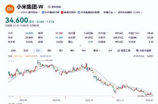 在2月3日小米集团的股价也显示出来,小米集团(01810.HK)股价继续下探,报收于34.60港元/股。