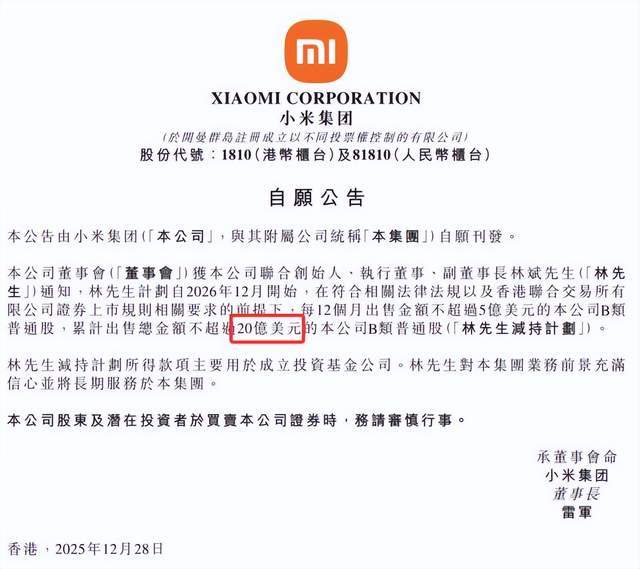 并且值得一提的是,去年12月28日,小米集团曾公告称,公司联合创始人、执行董事、副董事长林斌计划实施股份减持,累计减持公司B类普通股总金额不超过20亿美元,减持所得款项将主要用于成立投资基金公司。