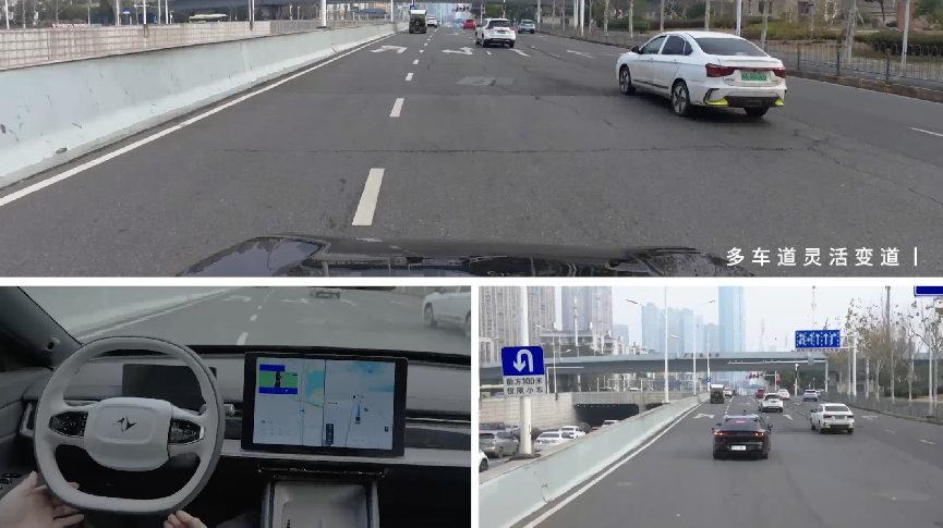 试驾驶出隧道,光线骤明,隧道口车流密集、车速渐升,智驾系统无感知迟滞,精准捕捉各车道车流速度与间隙。通过系统规划,实现连续四次变道,精准把控时机,变道衔接丝滑,无顿挫稳稳驶入目标车道。