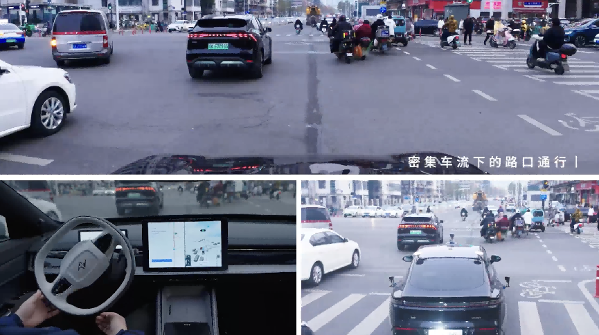 试驾行至武汉特色人车混杂大路口,行人穿梭、助动车随意切入机动车道、机动车伺机Cut-in,智驾系统面临极高挑战。智驾系统灵活避开右侧切入的助动车,精准把控与左侧车辆的车距,如本地司机般果断、快速通过路口。