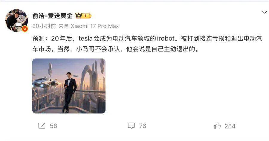 但小概率事件出现了。日前,追觅科技创始人兼CEO俞浩微博发文预测:“20年后,tesla会成为电动汽车领域的irobot。被打到接连亏损和退出电动汽车市场”。他在博文中还提到,“当然,小马哥不会承认,他会说是自己主动退出的。”