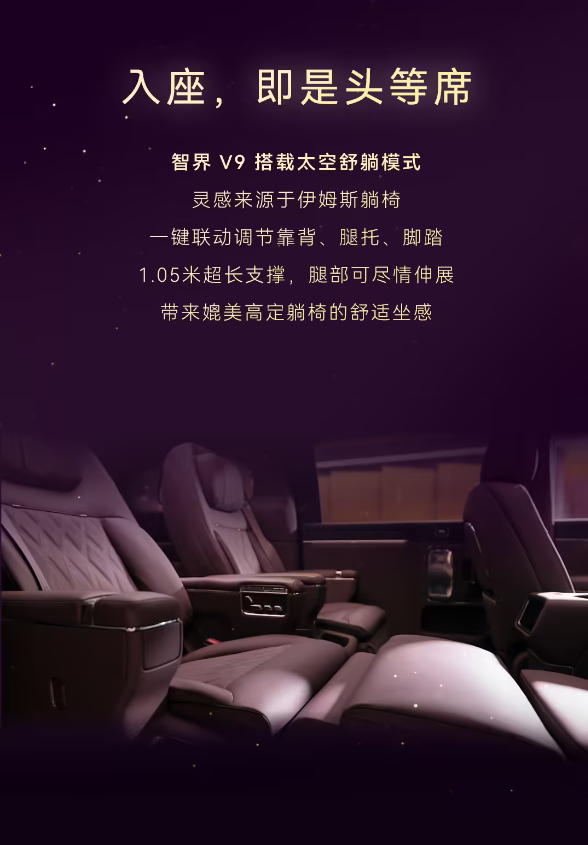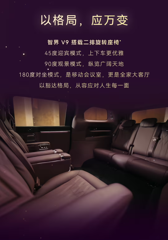 从此次曝光的座舱细节来看,智界V9的核心竞争力十分突出——绒霞紫内饰打造差异化优势,高端材质彰显旗舰质感,灵活的二排座椅兼顾多场景需求,首发的环抱式安全气囊补齐安全短板。对于追求豪华质感与出行体验的消费者而言,智界V9无疑是一个极具吸引力的选择。