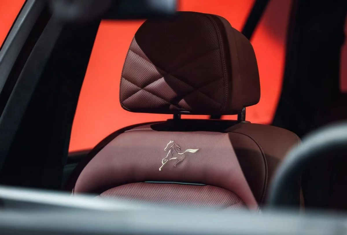 采用个性化定制磨砂宝石青车漆,低调中透着贵气;迎宾踏板采用金色设计,车内座椅则匹配火山红Sensafin合成皮,整体的配色喜庆又不浮夸。