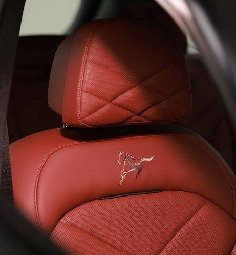 内饰部分同样融入了专属设计语言,金色迎宾踏板与火山红 Sensafin 合成皮座椅形成鲜明视觉对比,座椅靠背处的马年主题刺绣则进一步凸显了其限量身份。设计团队从敦煌壁画中的 “神马” 形象中汲取灵感,打造出专属的 “马版” 刺绣标识,生动勾勒出骏马的姿态与神韵,以 “马” 的意象传递力量、速度与开拓精神,为驾驶体验赋予了 “马若乘空” 的美好意境。