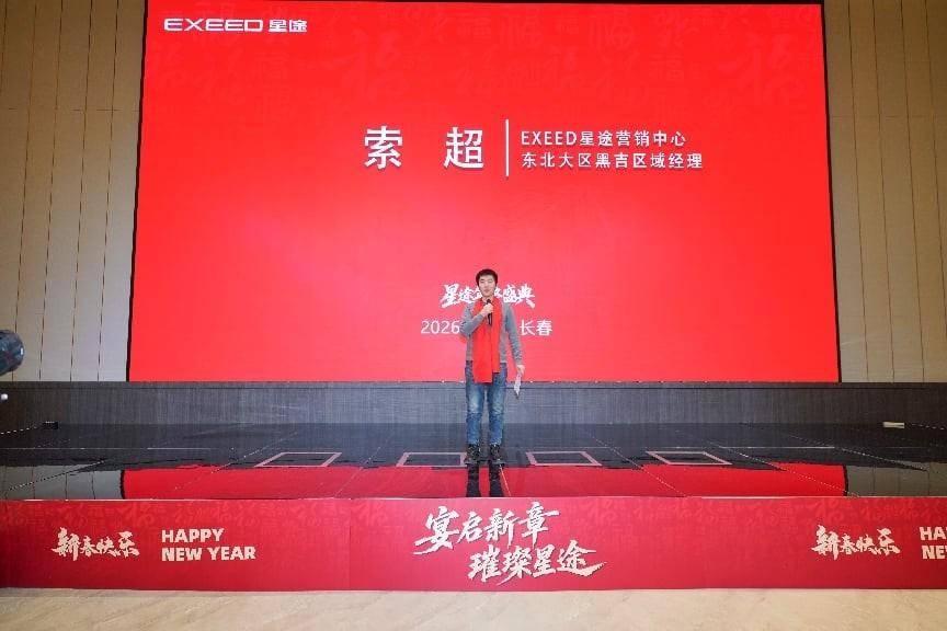 EXEED星途营销中心东北大区黑吉区域经理索超在致辞中表示:“星途品牌的每一步成长,都离不开在座每一位家人的支持与信任。今晚,我们不仅是一场宴会,更是一次家人的团聚,一次心灵的交流。”