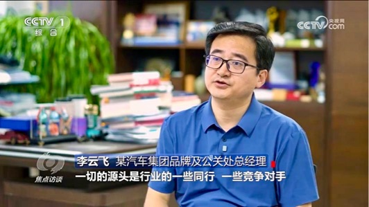 比亚迪集团品牌及公关处总经理李云飞在节目中表示:"黑公关、黑水军、黑自媒体都是表象,一切的源头是行业的一些同行、一些竞争对手"。对此,节目强调,整治汽车行业网络乱象并非单一企业的事,需要监管部门、车企、媒体及消费者协同发力,同时表态监管部门将强化执法力度,严厉打击网络黑产;同时,节目也呼吁车企,应坚守合规经营底线,主动拿起法律武器维护自身权益。