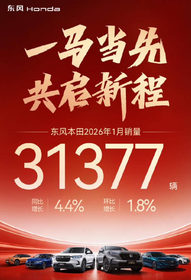 来自东风本田官方在社交媒体的公开信息显示,东风本田在2月2日表示:“东风本田1月销量开门红,同比环比均正增长”。其相关海报显示,2026年东本1月份销量31377辆,同比增长4.4%,环比增长1.8%实现了开门红,其中CR-V当月销量达到了19141辆,HR-V达到了2126辆。