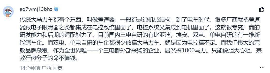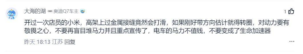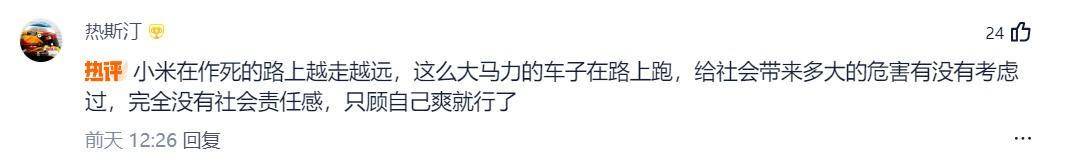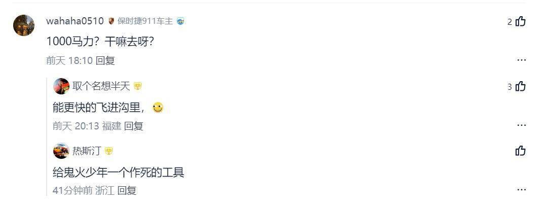 而且从上面这些网友们对小米YU7 GT的风评和反映来看,好像大家对于这1000匹的马力并不咋感冒和认可,那这,可能就又为小米YU7 GT的未来给蒙上了一层不确定性的阴影。最后,我也想问问大家:你们觉得电车真有必要弄这么大马力吗?如果真因大马力出了事故,车企应该兜底吗?评论区里留言说说看。(文/优视汽车 大卓 )