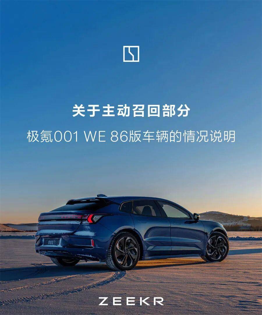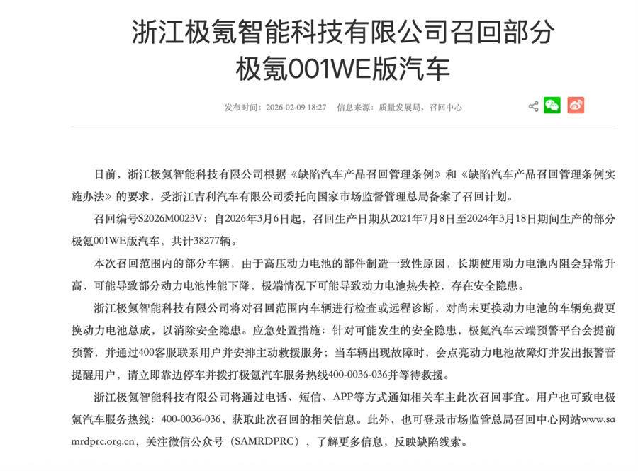 自2026年3月6日起,召回生产日期从2021年7月8日至2024年3月18日期间生产的部分极氪001WE版汽车,共计38277辆。原因显示,本次召回范围内的部分车辆,由于高压动力电池的部件制造一致性原因,长期使用动力电池内阻会异常升高,可能导致部分动力电池性能下降,极端情况下可能导致动力电池热失控,存在安全隐患。
