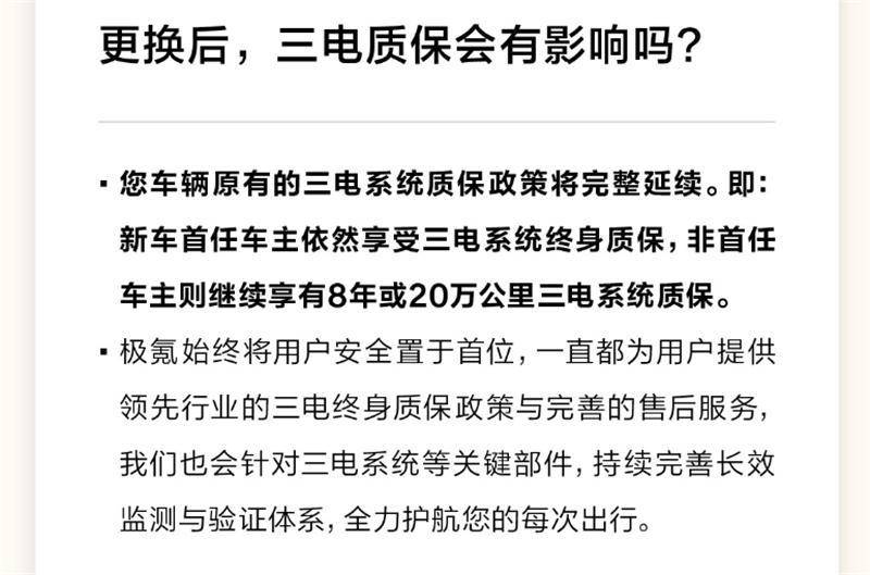 总而言之,极氪能够针对存在电池安全隐患的车辆进行召回,免费更换电池,属于知错能改,并且更换后也延续首任车主三电终身质保的承诺,体现出了一个负责任企业应有的态度。相信这也能让此前极氪受损的口碑得到修复,让老车主感到应有的关怀,让新用户也敢于选择极氪。