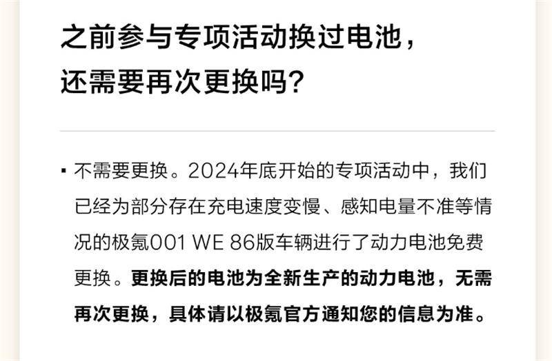 其实在此次公开召回之前,有部分001 WE86版车主因为电池性能下降已经进行了质量投诉,而极氪也通过冬季关爱服务等活动,为用户检测三电系统,将健康度异常的电池进行免费更换处理,为这些车主提供了售后保障。而这次大批量进行召回,从行业角度来看无疑是印证了当时这批欣旺达电池的确有问题,之前吉利旗下的威睿起诉欣旺达索赔超23亿元也是这个原因。