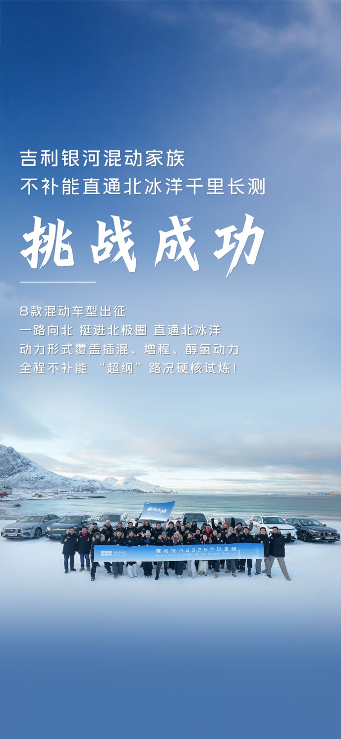 极夜笼罩下的北极腹地,寒风裹挟着冰雪肆虐,最低气温逼近零下40℃,这片被称为“汽车性能终极试炼场”的冰封荒原,迎来了一支来自中国的车队。2月9日,吉利银河冬测车队顺利抵达北极核心区域,圆满完成跨越瑞典与挪威、总里程超1000公里的不补能冰雪全场景长测,成为自主品牌中首个完成跨洲际、远征北冰洋的冬测挑战者,在北极冰原上镌刻下中国汽车工业的崭新印记。