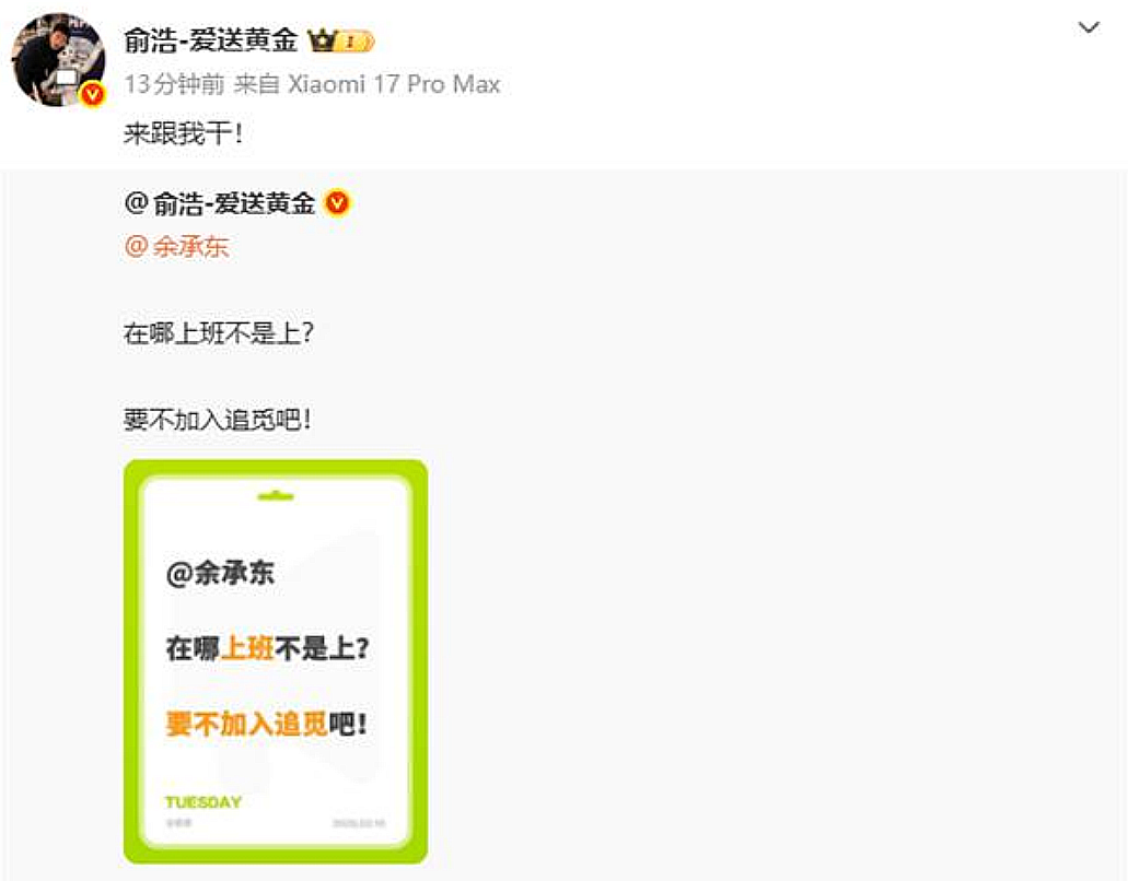 俞浩邀请余承东加盟追觅?