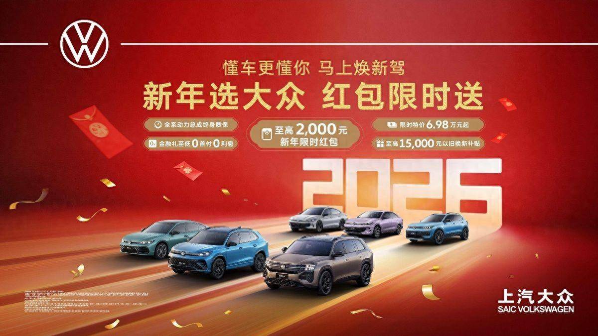 即日起至2026年2月15日,购买上汽大众大众品牌燃油车型,即有机会享受五重新年购车礼遇:至高2,000元新年限时红包、全系动力总成终身质保、限时特价6.98万元起、金融礼至低0首付0利息、至高15,000元以旧换新补贴等多重优惠同步放送,限时礼遇即刻把握,先到先得!(*详情请洽当地经销商)