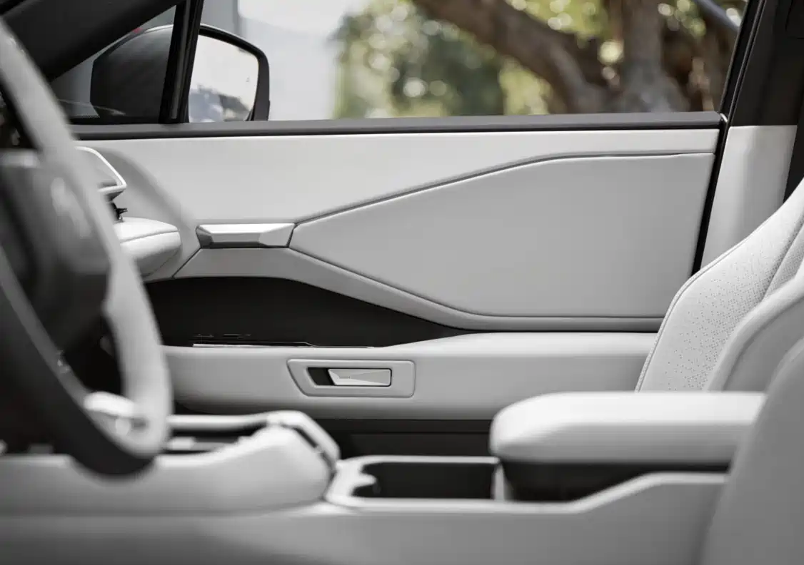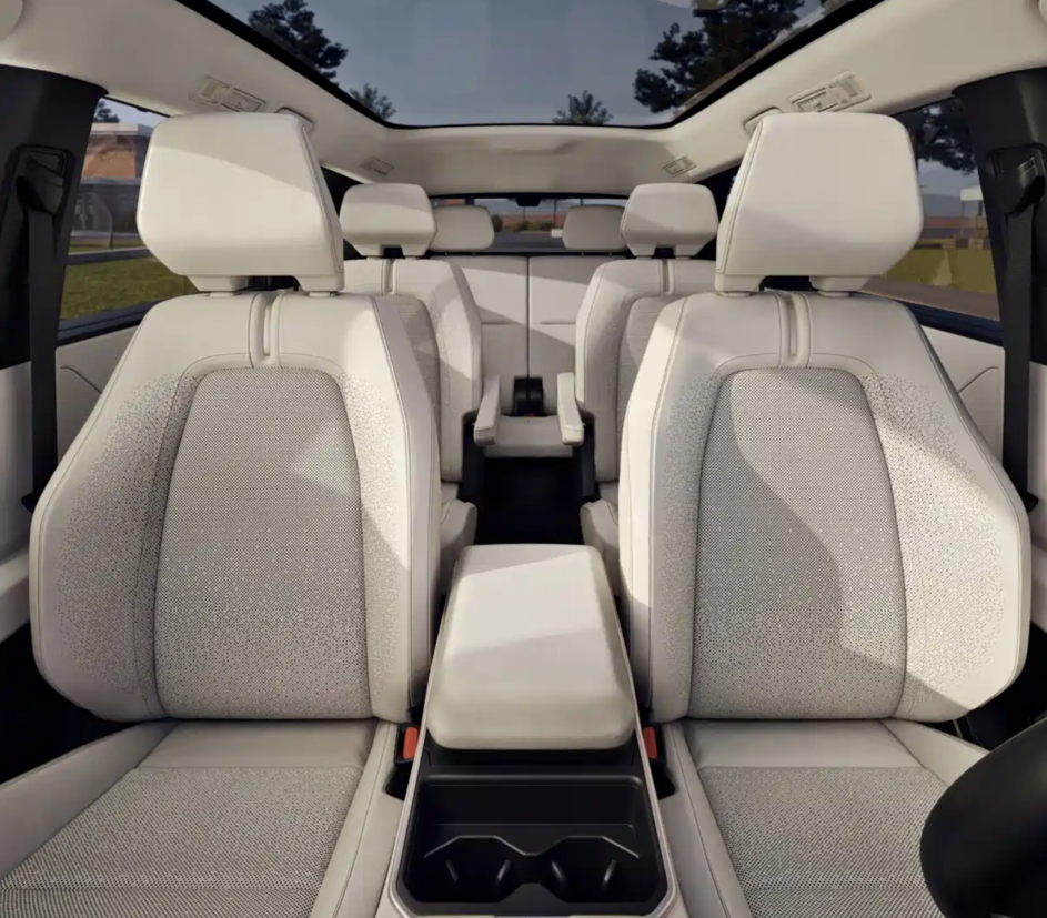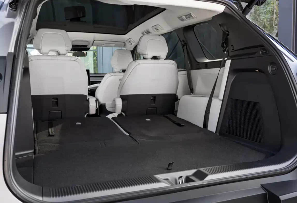 内饰设计相对简约,采用了电动汽车常用的悬浮屏幕和仪表盘,物理按键有一定保留,也有大尺寸的无线充电板;水杯槽的位置偏后;座椅材质应当是皮革和织物材料混搭;第三排座椅折叠后的平整度尚可,车内没有过多的屏幕。