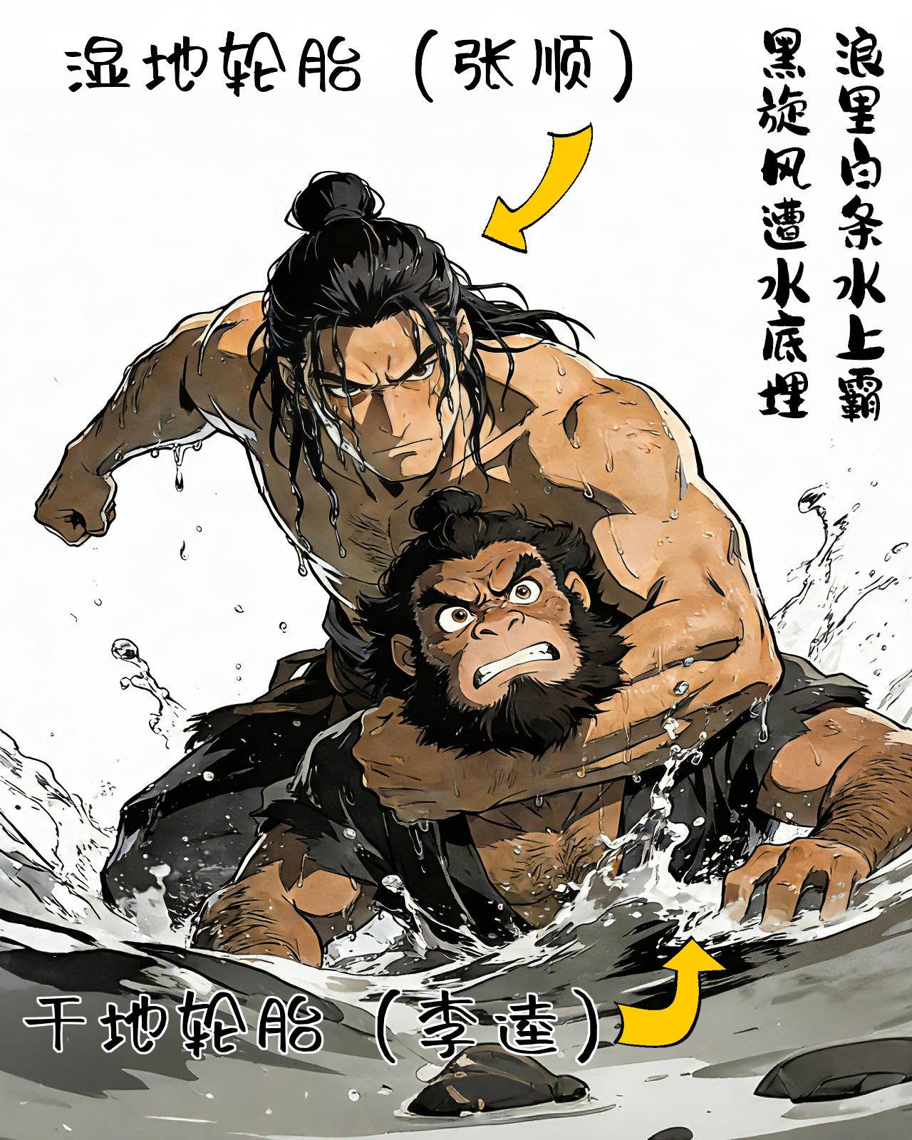 但到了水里,湿地胎张顺大显神威,把干地胎李逵灌个死去活来。