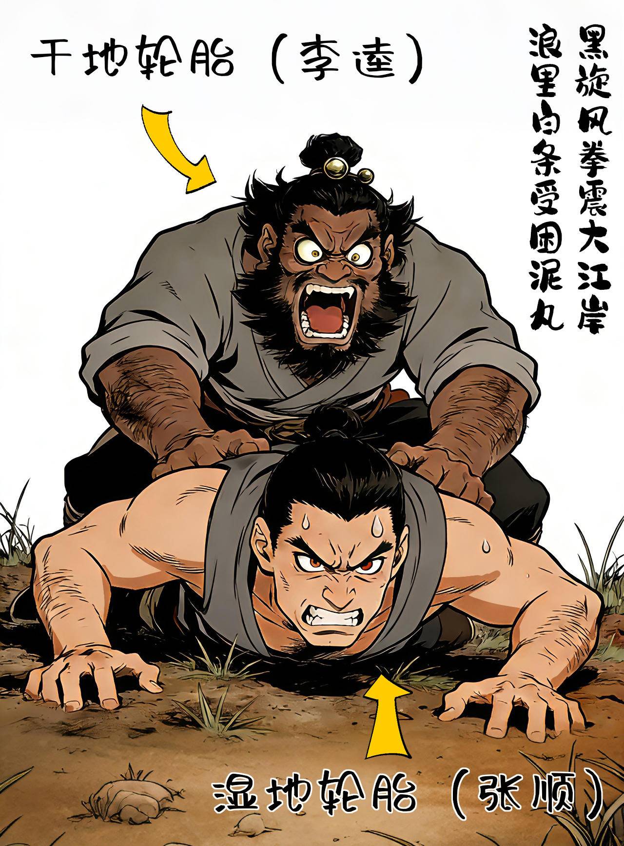 这就好比《水浒》里面的黑旋风李逵和浪里白条张顺,李逵是干地胎,张顺是湿地胎,在岸上李逵必然暴打张顺。
