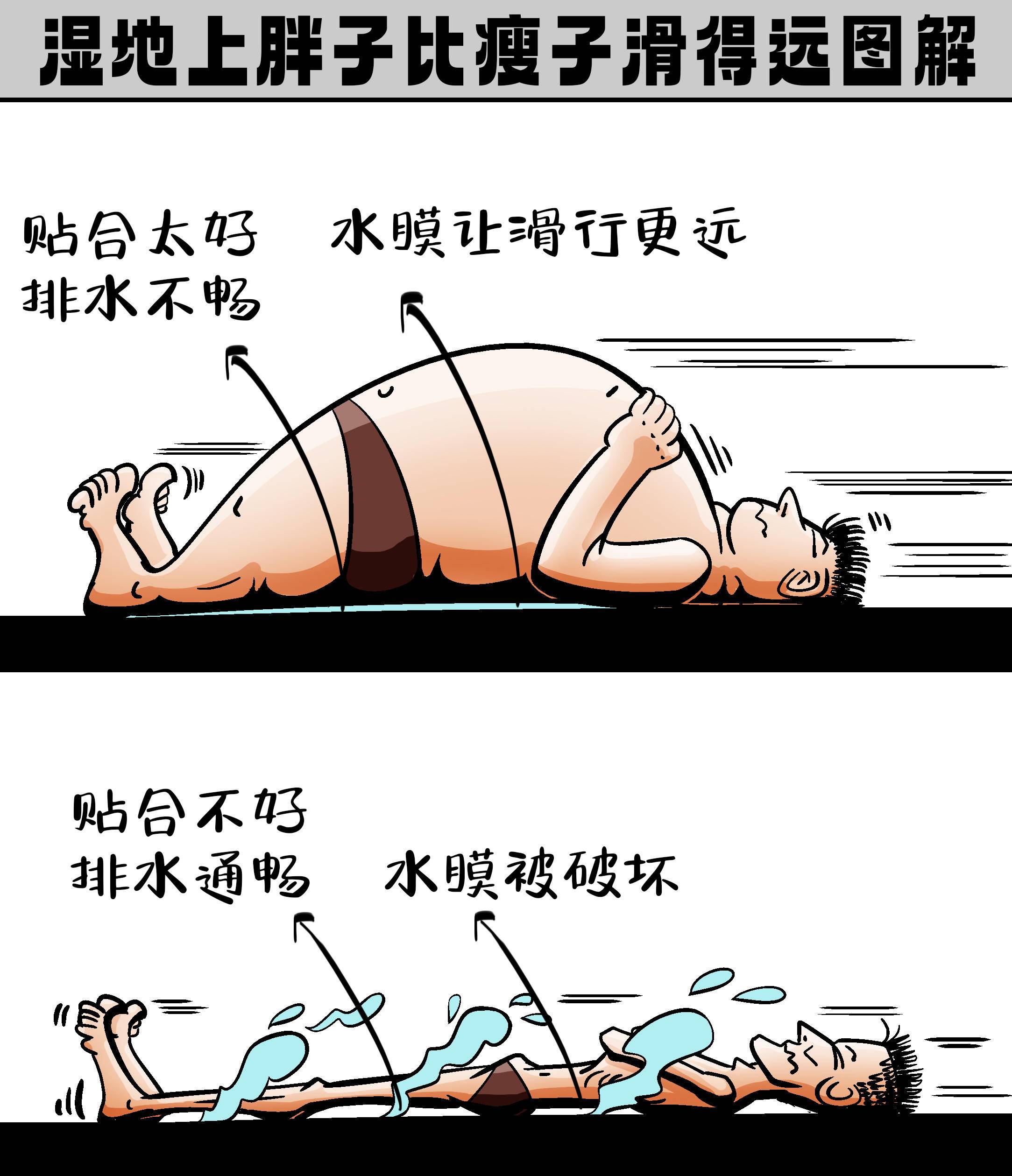 反观瘦子,身材“咯哩咯楞”,跟地面老是合不来,到处都能排水,想形成水膜都难,滑起来自然就没那么带劲。