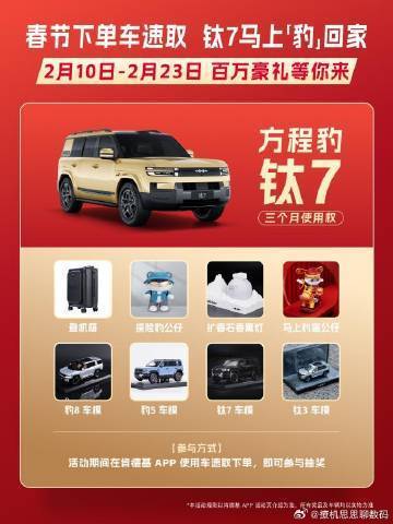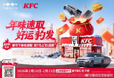 新春年味怎么品?方程豹与肯德基的暖心联动,给出了别样答案。2月10日至2月23日,两大国民品牌以“年味速取,好运豹发”为主题开启跨界合作,将新能源出行与餐饮服务巧妙融合。用户通过肯德基APP“车速取”下单,即可参与抽奖,赢取方程豹钛7汽车3个月使用权,还有海量品牌定制周边相送。