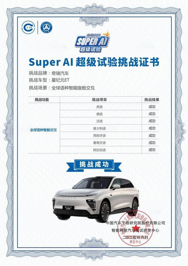 2025年,ET历经覆盖英语、德语、法语、意大利语、西班牙语、葡萄牙语及阿拉伯语七大全球语种的严格测试,以精准且快捷的识别率与执行效率,打破全球智能汽车语言壁垒,成功通过中国汽车工程研究院的严苛测试,并获得行业内首个“全球语种智能座舱交互”认证。