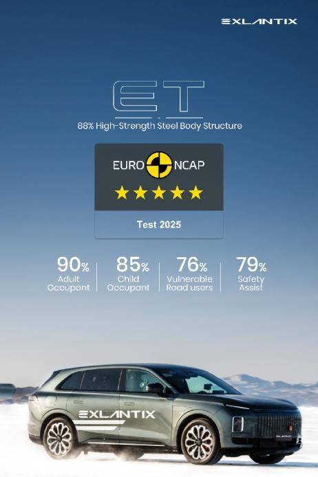在世界上最严苛的汽车安全测试机构之一——Euro NCAP最新测试标准下,EXLANTIX ET(国内名为ET)以成人乘员保护0%、儿童乘员保护85%、弱势道路使用者保护76%、安全辅助系统79%的高分成绩,通过系统性的严苛测试,获得最高五星安全评级。