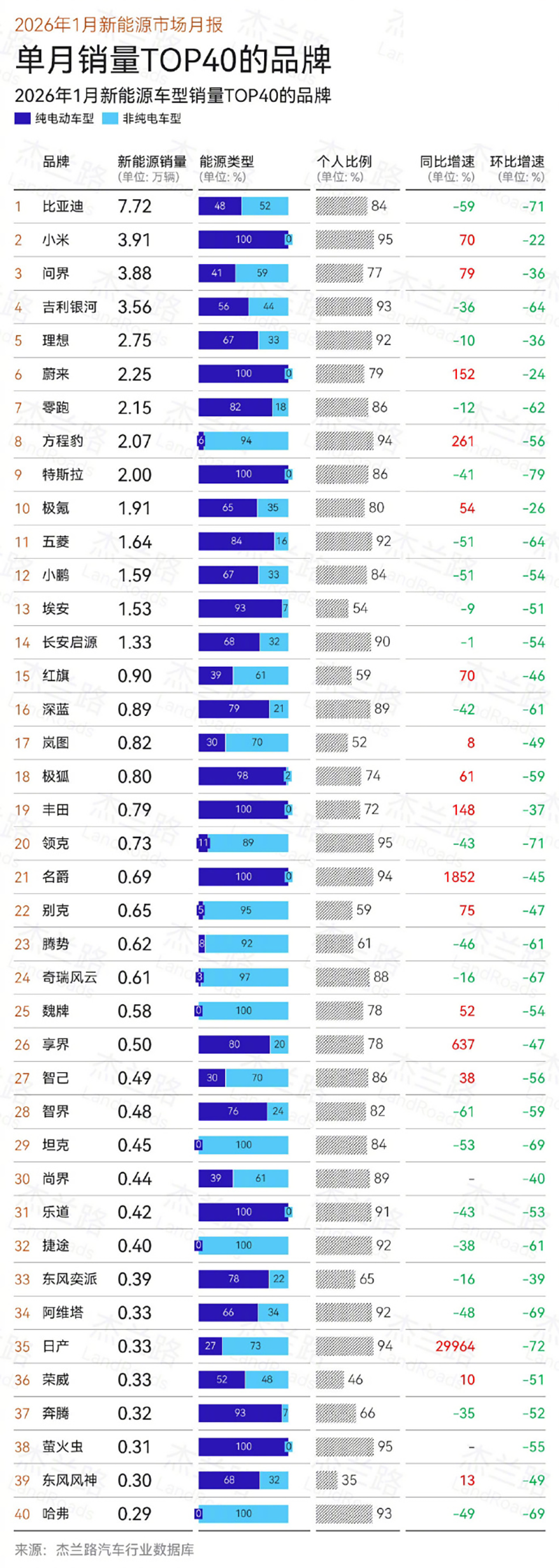 比亚迪汽车2026年1月销量有所下滑,尤其是环比缩减过半;可是以比亚迪五大子品牌的体量来看,似乎并不会被轻松的超越,至少以小米汽车目前的水平来看还很难实现。所以这一热议话题其实是有前提条件的,先来看由杰兰路统计发布的排行榜,比亚迪还在第一位。