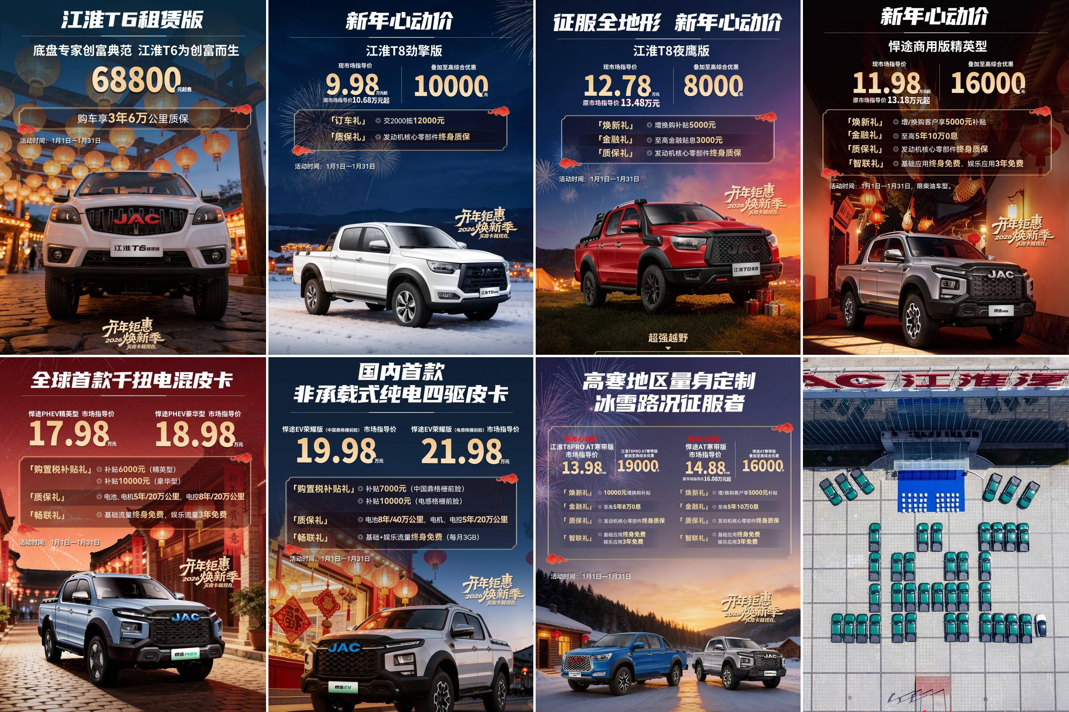 国内市场是江淮皮卡的基石。新年伊始,江淮皮卡“2026焕新季”火热来袭,江淮T6租赁版、江淮T8劲擎版/夜鹰版、江淮悍途商用版精英型/悍途PHEV/悍途EV,以及江淮T8 PRO AT寒带版、江淮悍途AT寒带版,纷纷推出诚意满满的心动价、补贴礼、金融礼和质保礼,赢得了广大用户的认可。
