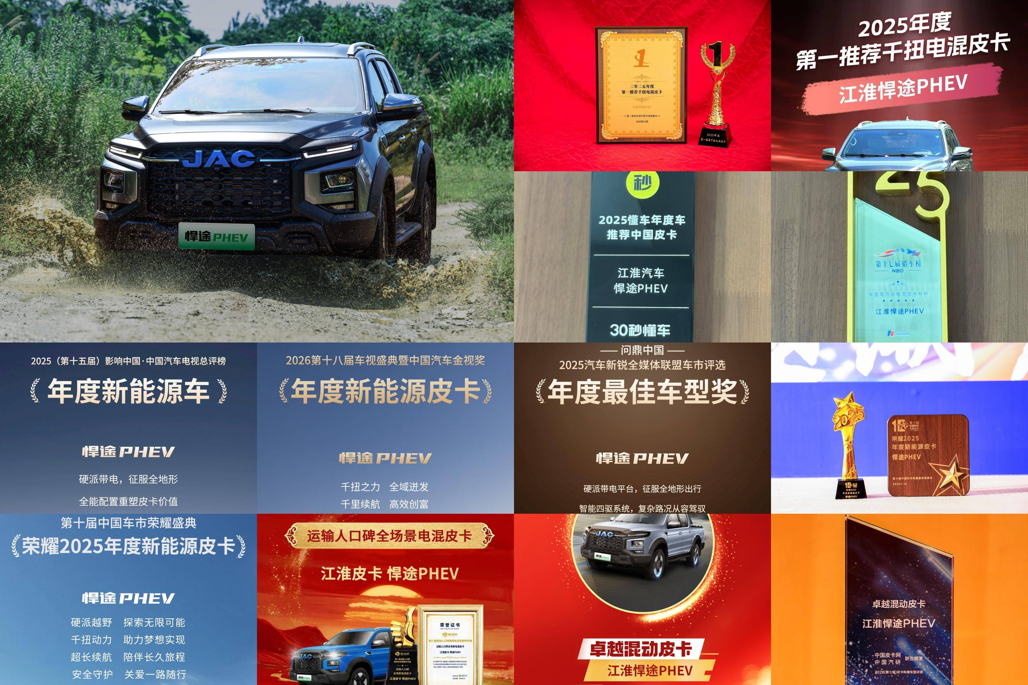 在收获全球用户信赖的同时,江淮皮卡的产品和技术再获权威评选认证。岁末年初,江淮悍途PHEV接连斩获权威媒体“年度第一推荐千扭电混皮卡”、“年度新能源车”、“年度新能源皮卡”、“年度最佳车型奖”、“全场景电混皮卡”等重磅奖项,成为响当当的年度电混皮卡。