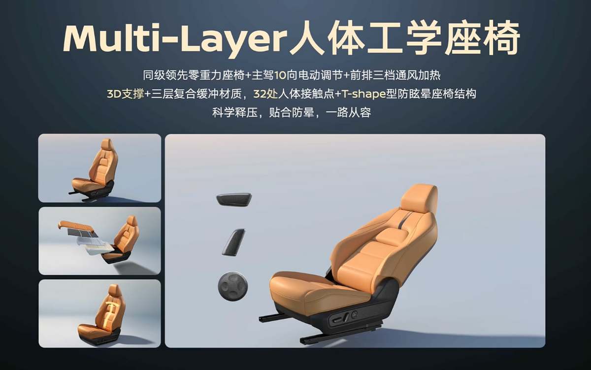 乘坐舒适性保持优势,采用Multi-Layer人体工学座椅,同级领先零重力座椅+主驾10向电动调节+前排三档通风加热,久坐不累。