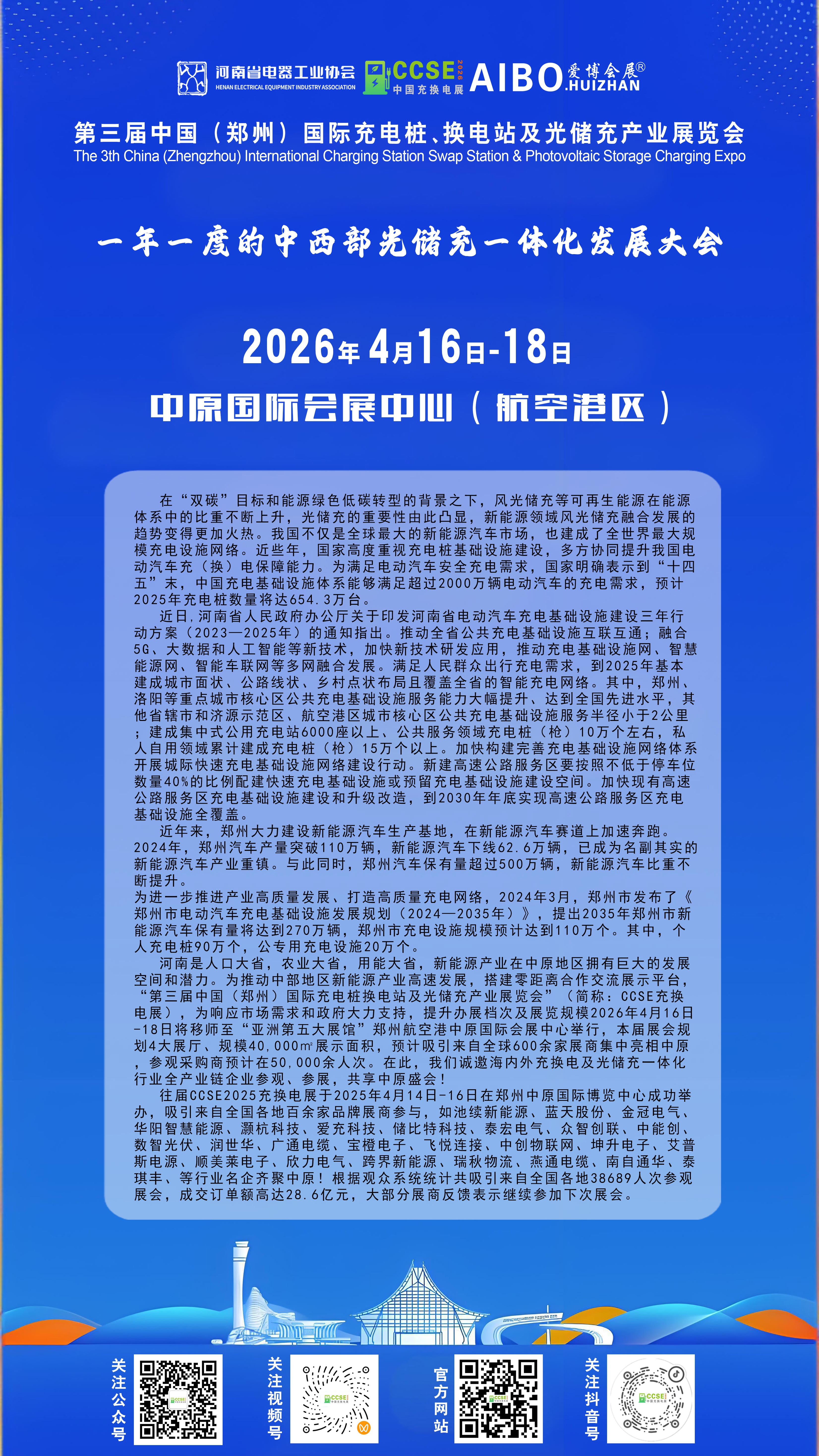 河南是人口大省,农业大省,用能大省,新能源产业在中原地区拥有巨大的发展空间和潜力。为推动中部地区新能源产业高速发展,搭建零距离合作交流展示平台,由河南省电器工业协会、北京爱博国际展览有限公司联合主办的“第三届中国(郑州)国际充电桩换电站及光储充产业展览会(简称:CCSE充换电展)”,为响应市场需求和政府大力支持,提升展会档次及办展规模2026年4月16日-18日将移师至“亚洲第五大展馆”郑州航空港中原国际会展中心举行,本届展会规划4大展厅、规模40,000㎡展示面积,预计吸引来自全球600余家展商集中亮相中原,参观采购商预计在50,000余人次。在此,我们诚邀海内外充换电及光储充一体化行业全产业链企业参观、参展,共享中原盛会!