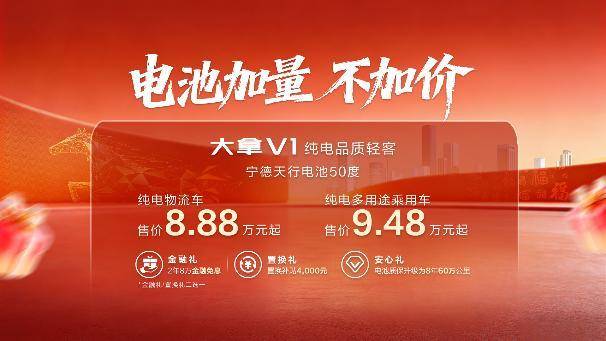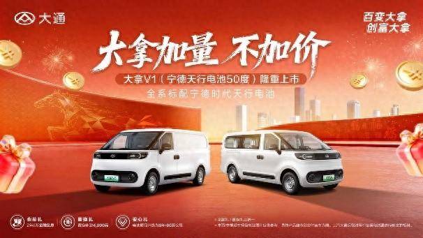 2月25日,“中国轻客第一品牌”大通打响马年新车发布第一枪,旗下明星车型大拿V1(宁德天行电池50度)震撼上市!新车全系标配宁德天行电池50度,在保持原有价格体系不变的基础上,实现电池配置、续航能力、补能效率与质保政策全方位升级,给到用户“加量不加价”的诚挚优惠,为城配物流、小微创业等群体打造高效、经济、可靠的绿色创富工具,也为2026年商用新能源市场的发展树立全新价值标杆。