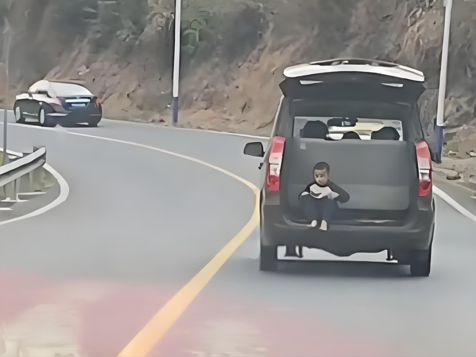 广东梅州一路段,一辆面包车在道路上行驶着;在后方车辆人员拍摄的画面里可以看到车辆的尾门呈打开的状态,第三排座椅正常放置,于是车辆的后备箱空间是非常狭小的。而就在这狭小的后备箱里竟然蹲坐着一个小男孩,而且还是赤脚踩在后保险杠的边缘上!在行驶中,小男孩忽忽闪闪多次差点跌落;随后小男孩还有站起来扒住后排座椅的动作,可以说是非常非常的危险!这不是夸张的描述。