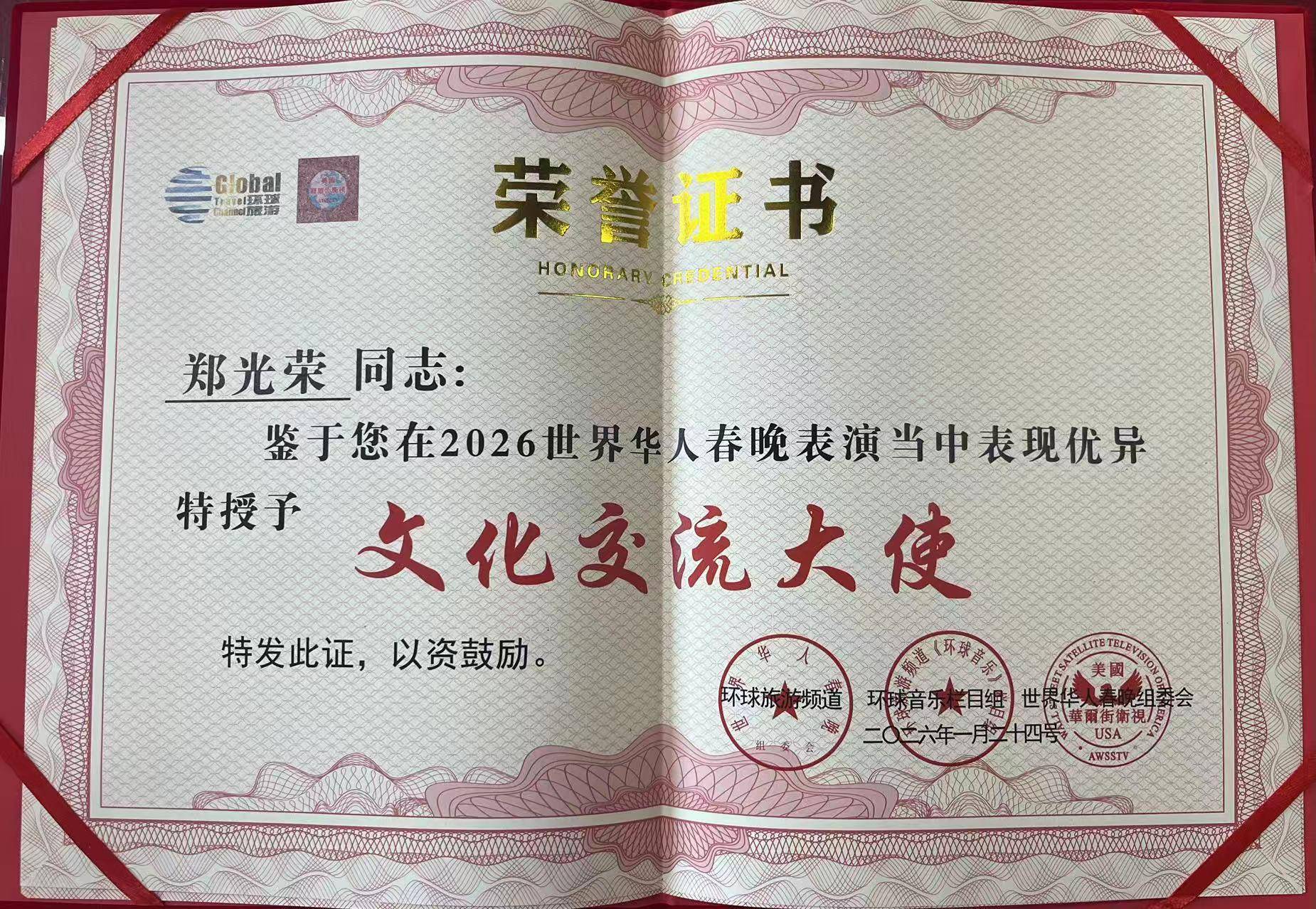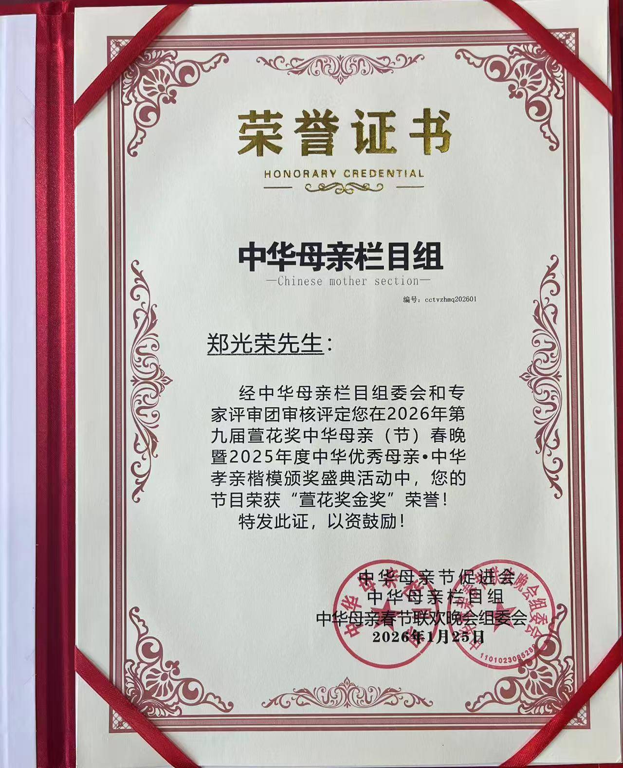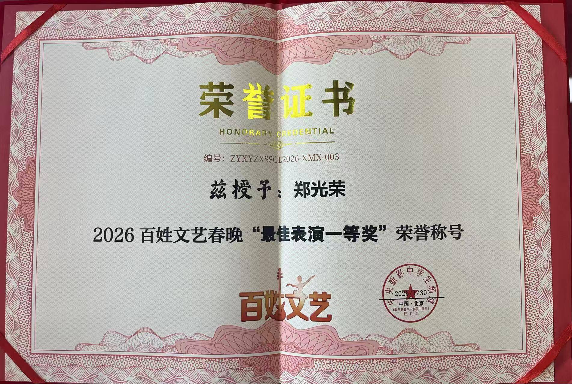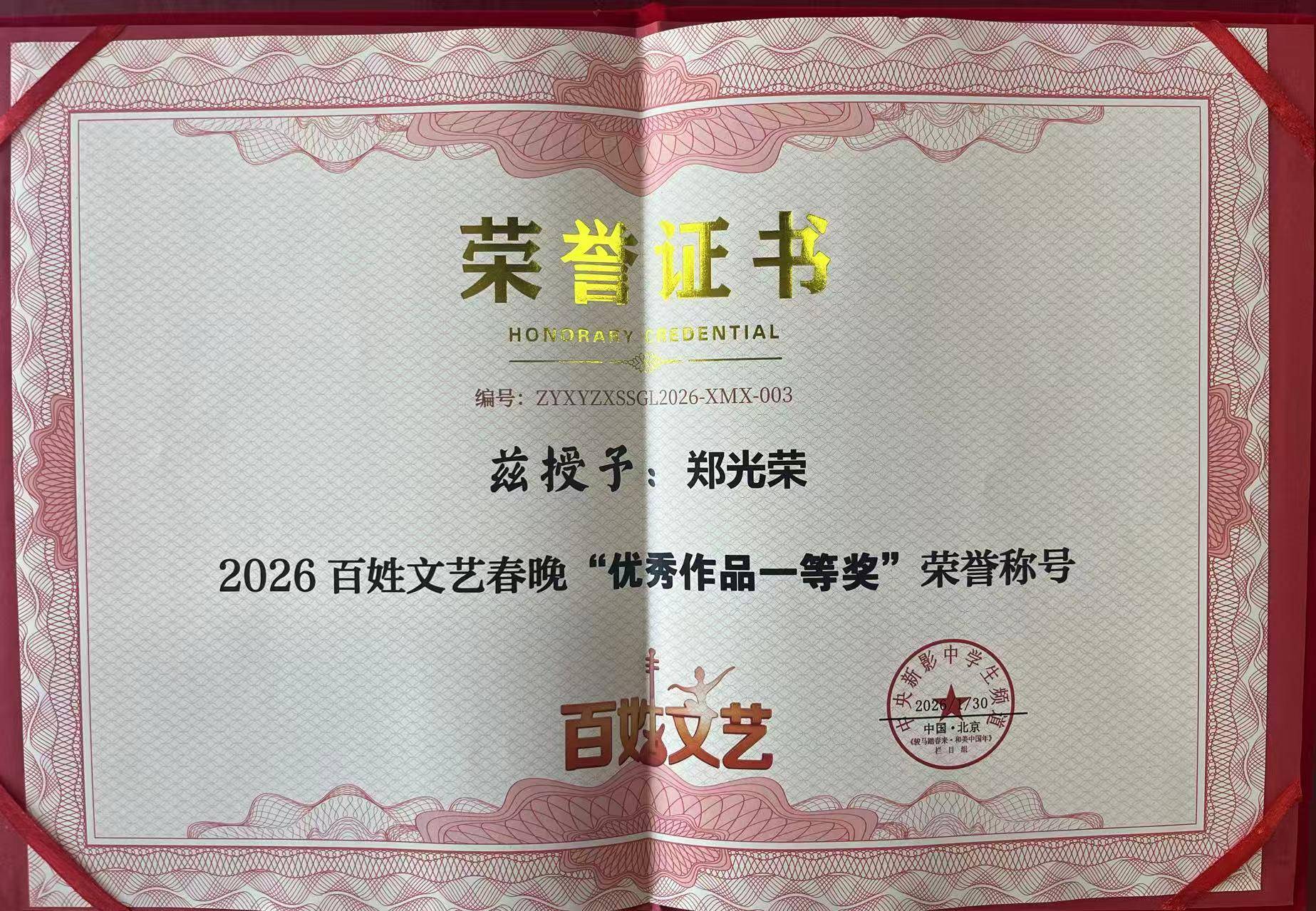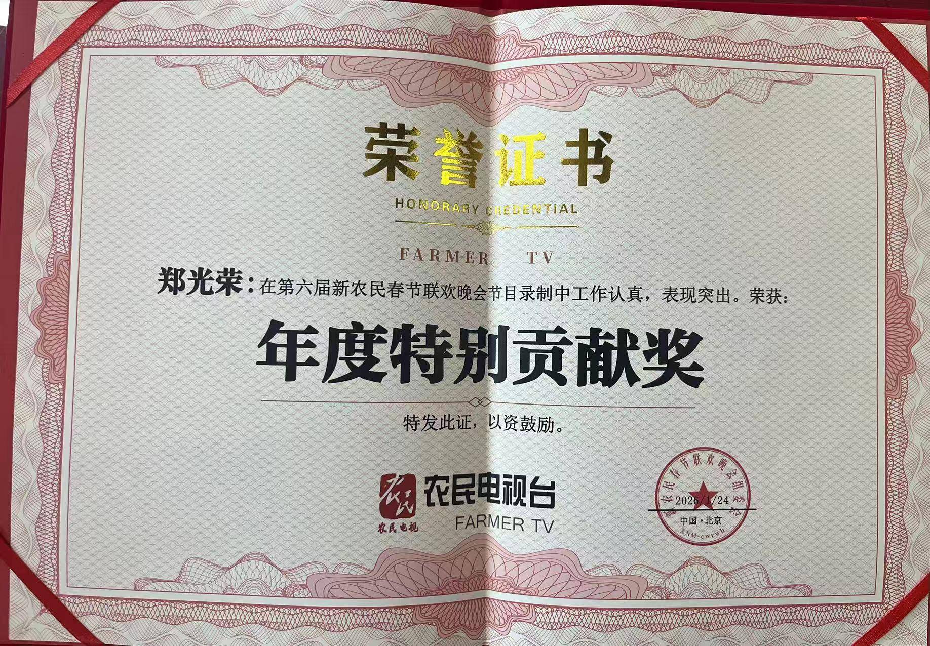 2026年1月24日,北京,2026第六届新农民春节联欢晚会(新农春晚)圆满完成录制。北京市非物质文化遗产吆喝(叫卖)传承人郑光荣,以晚会执行导演身份深度参与本届新农春晚全流程创作,并受邀担任晚会推荐官登台献艺,凭借卓越的组织执行能力与极具创新的舞台表现,荣获晚会“年度特别贡献奖”,用乡音与匠心为新时代农民文化发声,为乡村振兴精神文化建设注入强劲动力。
