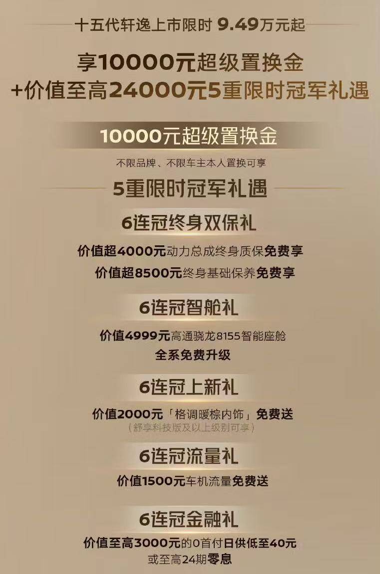 为了回馈用户信赖和支持,让严选品质与安心服务相伴每一次出行,东风日产面向轩逸全系车型,推出动力总成终身质保免费权益,让用户享受到真正的安心无忧。其中,面向十五代轩逸,推出 10000 元超级置换金,以及 6 连冠终身双保礼、6 连冠智舱礼、6 连冠上新礼、6 连冠流量礼、6 连冠金融礼等价值 至高2.4 万元 5 重限时冠军礼遇;面向十四代轩逸,推出 10000 元超级置换金及幸福购车礼、幸福保养礼、幸福无忧礼 3 重幸福礼遇;面向轩逸・经典,推出 10000 元超级置换金及超值金融礼、超值双保礼、超值无忧礼 3 重超值礼遇。