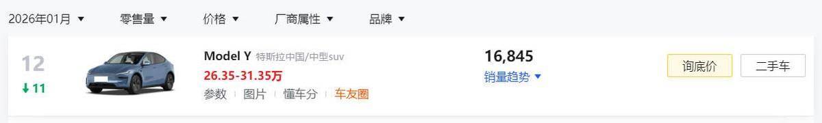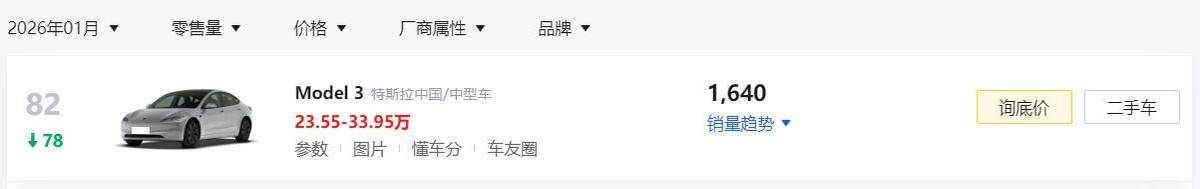从市场方面的表现来看,2026年1月,Model Y的销冠位置被小米YU7取代,自身月销量数据下滑到16845辆,排在SUV销量总榜单的第12位;至于Model 3,单月销量更是滑落至1640辆,排在纯电车型销量总榜单的第52位。